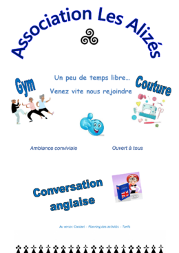 Association Les Alizés 20 place de Fareham 56000 Vannes Tel 06 30 19 48 17 asso.lesalizes56@outlook.com https://m.facebook.com/people/Asso-Les-Aliz%C3%A9s-Vannes/100071239561006/ Gym, couture, anglais… Un peu de temps libre, venez vite nous rejoindre ! Ambiance conviviale, ouvert à toutes et à tous…