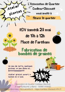 Atelier Plantes – Bombes de graines by Alain RIVAT • 21 mai 2021 Calendrier Ajouter au calendrier Ajouter au calendrier Timely Ajouter à Google Ajouter à Outlook Ajouter au calendrier Apple Ajouter à un autre calendrier Exporter vers XML Quand : 29 mai 2021 @ 10h00 – 12h00 2021-05-29T10:00:00+02:00 2021-05-29T12:00:00+02:00 Où : Place Fareham Place Fareham 56000 VANNES